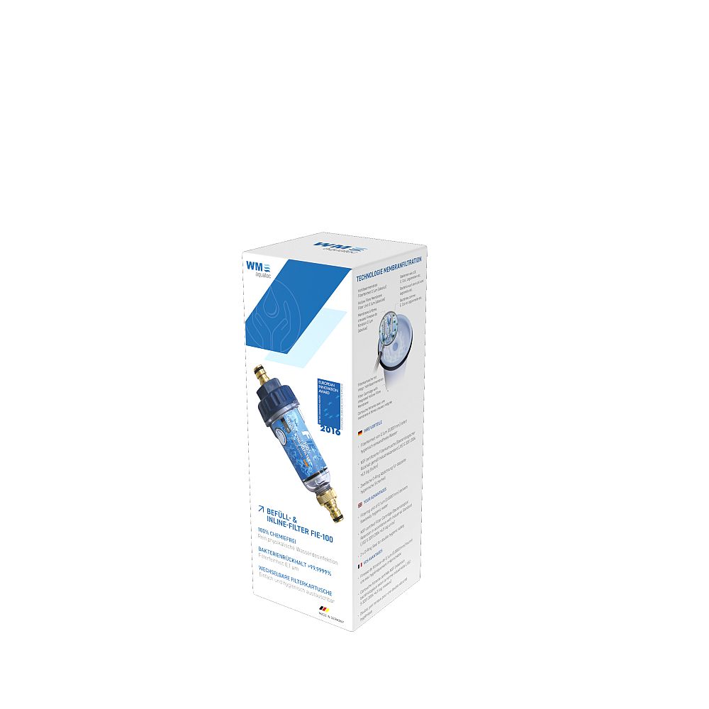 Trinkwasserdesinfektion - 100% chemiefrei! Der Befüll- u. Inlinefilter FIE-100 ist eine kompakte, sterile Filtration, die rein physikalisch Krankheitserreger wie Bakterien, Pilze, etc. zu nahezu 100% entfernt und somit hygienisch einwandfreies Wasser garantiert. Er eignet sich zur Befüllung/Betankung des Frischwassertanks genauso, wie zur Installation vor einer Armatur.Ihre Vorteile:Entfernt Krankheitserreger (Bakterien, Pilze, etc.) >99,9999% Filterfeinheit von 0,1µm (0,0001mm) liefert hygienisch einwandfreies Wasser 100% ohne chemische Zusätze - rein physikalische Filtration Inkl. Hygiene-Verschluss & Aufbewahrungsbox Mit Gardena® kompatiblem Anschluss Jetzt auch Kartusche für Filterwechsel erhältlich Universell einsetzbar & sofort betriebsbereit Filterkartuschenwechsel empfohlen nach 6 Monaten