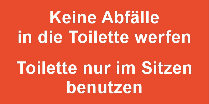 Weiße selbstklebende Vinylfolie mit rotem Aufdruck (negativ) Schrift weiß "Keine Abfälle in die Toilette Format 60 x 30 mm