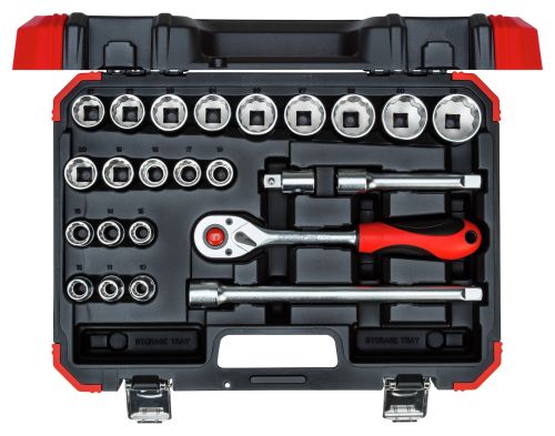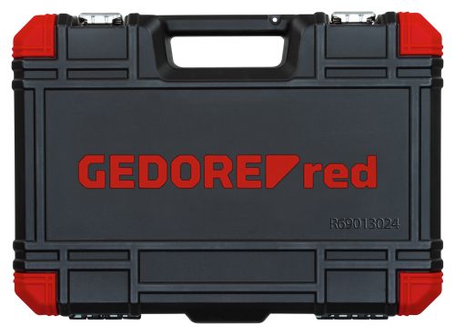 STECKSCHLÜSSEL-SATZ 1/2" 24-TEILIGVerbindungsvierkant nach DIN 3120 - A 12,5, ISO 1174, mit KugelarretierungInnenvierkantantrieb nach DIN 3120 - C 12,5, ISO 1174, mit Kugelfangrille2K-Umschaltknarre 1/2", Rechts-/Linkslauf durch Hebel umschaltbar, Druckknopfauslösung, feinverzahnt, Ovaler Kopf, 2-Komponenten-Griff, handschonende Kraftübertragung, für SteckschlüsseleinsätzeSteckschlüsseleinsatz 1/2", 12-kant, metrisch, kurz, Ausführung nach DIN 3124, ISO 2725Steckschlüsselverlängerung 1/2"Vergrößerungs-Adapter/Gleitstück 3/8" x 1/2", zum Antrieb von Steckschlüssel- und SchraubendrehereinsätzenChrom-Vanadium-Stahl, matt satiniert verchromtFür handbetätigte SchraubfälleKunststoffkoffer im GEDORE red DesignKlemmgesicherte WerkzeugeMetallscharniere/-verschlußInhalt:1/2" 2K-Hebel-Umschaltknarre feinverzahnt, 72 Zähne | 250 mm1/2" Steckschlüsseleinsatz 12-kant SW 10 11 12 13 14 15 16 17 18 19 20 21 22 23 24 26 27 28 30 321/2" Steckschlüsselverlängerung 125 250 mmVergrößerungsstück/Gleitstück 3/8" x 1/2" | 44 mm