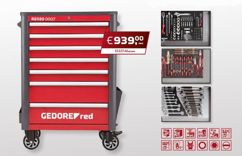 R2207 1004 WERKSTATTWAGEN WINGMAN MIT 7 SCHUBLADEN R20200007 + SORTIMENT R21010004 130-teilig ››Solide Stahlblechkonstruktion, verwindungssteif, hoch belastbar››7 Schubladen mit Teleskop-Vollauszug mit Einzelverriegelung(Einhandbedienung)››Tragfähigkeit 35 kg per Schublade››Zentralverriegelung mit Zylinderschloss mit 4 SchlüsselnR22350000 Werkzeugsatz Einsätze, Knarre,Zubehör 1/4"-1/2"R22350005 Werkzeugsatz Schraubendreher,Zangen, Hammer, MeißelR22350006 Werkzeugsatz Maul-Ringratschenschlüssel, Doppelmaulschlüssel