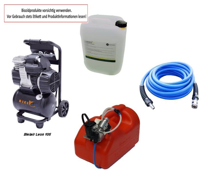 Biozidprodukte vorsichtig verwenden. Vor Gebrauch stets Etikett und Produktinformationen lesen!Komplettpaket Bielair Leon 105 Set mit WF air 5 bestehend aus:1 x Kompressor Bielair Leon 105 ölfreio Kesselgröße: 10 lo Kesseldruck: 10 baro Ansaugleistung: 175 l/mino Liefermenge: 105 l/mino Drehzahl U/min1440o Schalldruckpegel LWA/dB85/64o Motor KW/PS1,1/1,5o Volt/Hz230/50o Maße in mm405 x 395 x 690o Gewicht: 28kg1 x Vernebelungsgerät WF air 51 x Druckschlauch Superflex 10m1 x 5-Liter Kanister ASANTO® airZur Raumdesinfektion 1:5 mit Wasser verdünnen - Besarf für die Raumdesinfektion ca. 100 ml Gemisch/KubikmeterUmweltfreundliche RaumdesinfektionIm Gegensatz zur bisher bekannten Desinfektion durch Ozonreinigung, ist die Kaltvernebelung mit dem biologischen Desinfektionsmittel ASANATO air® einfach in der Handhabung. Das Fahrzeug, Bereiche oder Räume sind direkt und auch während der Desinfektion nutzbar und eine Unterbrechung Ihrer Arbeitsabläufe ist nicht nötig. Schutzkleidung wird ebenfalls nicht benötigt um diese umweltfreundliche Art der Desinfektion durchzuführen. Menschen, Tiere und die Natur werden nicht belastet. ASANTO air® wirkt innerhalb von 1 Minute bakterizid (Bakterien abtötend, keimtötend), viruzid (Viren unschädlich machend), fungizid (Pilze und ihre Sporen abtötend) und sogar tuberkulozid (Tbk-Bakterien abtötend). Mikroorganismen wie Bakterien, Viren und Pilze werden um 99,9 % reduziert. Dazu gehören auch Corona-Viren- denn ASANTO air® wirkt unspezifisch, d.h. nicht nur auf bestimmte Mikroorganismen, sondern auf alle. Das Konzentrat ist nicht toxisch, pH-neutral (6 bis 8), sehr gut hautverträglich, nicht umweltgefährdend (kein Gefahrstoff), sowie frei von Alkohol, Parfüm und Aldehyd. Unser Angebot an Vernebelungsgeräten sowie dem passenden Desinfektionsmittel, deckt die unterschiedlichen und vielseitigen Anwendungsgebiete der Kaltvernebelung lückenlos ab.Raumdesinfektion – Hygiene die man atmen kannHygienisch reine Luft, ist vor allem in geschlossenen Räumen oder an Orten an denen wir uns längere Zeit aufhalten, von höchster Bedeutung.Störende, intensive und auch penetrante Gerüche, können unser Wohlbefinden erheblich beeinträchtigen. Tabakrauch, Abfälle oder auch abgestandene, verbrauchte Raumluft - wer wünscht sich hier keine frische und reine Luft!Viren, Bakterien und Schimmelpilze befinden sich auf vielen Gegenständen und Orten. Ob im Sanitärbereich, auf Lebensmitteln, Oberflächen oder auch in der Luft. Meist nicht sichtbar, aber dennoch da!Mit passenden Desinfektionsmitteln und Kaltvernebelungsgeräten reinigen sie innerhalb kürzester Zeit Ihre Umgebung und erhalten keimfreie, frische und vor allem dekontaminierte Luft.
