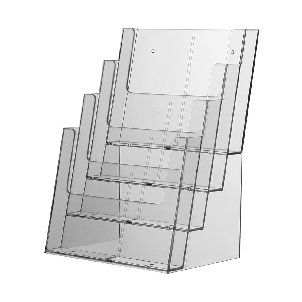 Treppenförmiger Prospektaufsteller aus glasklarem Polystyrol mit vier hintereinander angeordneten Prospektfächern. Die Standversion ist ideal geeignet zur Präsentation Ihrer Flyer und Broschüren im DIN A4 Format für den Einsatz auf Tischen und Infotheken. Der treppenförmige Tischständer ist leicht nach hinten geneigt, so dass ein optimaler Lesewinkel entsteht. Es können 4 unterschiedliche Prospekte übersichtlich und auf kleinstem Raum präsentiert werden. Jedes Prospektfach ist mit einer Fülltiefe von 30 mm ausgestattet.Lieferzeit: ca. 1 Woche