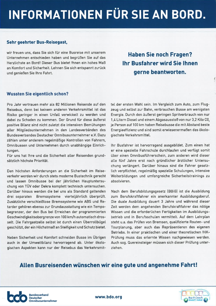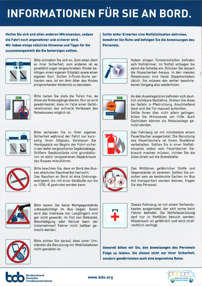 Die Bordinformationen informieren Ihre Reisegäste über die moderne Bustechnik, sowie über die Ausbildung des Busfahrers und vermittelt auf diese Weise ein hohes Sicherheitsgefühl. Darüber hinaus enthält sie Hinweise und Anregungen, die seitens der Fahrgäste beachtet werden sollten, wie beispielsweise das Anlegen von Sicherheitsgurten und Informationen zu den Notausgängen, Nothämmern und Nothähnen. Die Bordinformation ist vierfarbig gedruckt auf 300 gr. Papier, Folienkaschiert. Größe DIN A4.Bund à 50 Infoblätter.