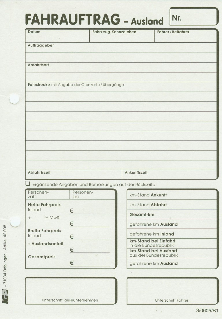 Wie Fahrauftrag Inland, jedoch mit getrennter km- Angabe und Preisangabe für die im In- und Ausland gefahrenen Kilometer. Format DIN A5 hoch, Block mit 50 Blatt