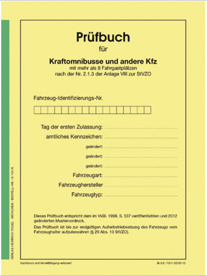 Prüfbuch für Kraftomnibusse und andere Kfzmit mehr als 8 FahrgastplätzenDieses Prüfbuch muss von der Erstzulassung an über die gesamte Lebensdauer des Fahrzeuges geführt werden. In ihm wird die Durchführung der Hauptuntersuchungen und Sicherheitsprüfungen dokumentiert. In diesem Buch können die jeweiligen Hauptuntersuchungen und Sicherheitsprüfungen über einen Zeitraum von 20 Jahren dokumentiert werden. In die praktische Klarsicht-Tasche in der Mitte des Prüfbuches können die Nachweise durchgeführter HU/SP gesteckt werden. Diese Dokumente müssen mindestens bis zur entsprechenden nächsten Untersuchung/Prüfung aufbewahrt werden. Das Prüfbuch muss bis zur endgültigen Außerbetriebsetzung des Fahrzeugs vom Halter aufbewahrt werden. Deswegen ist das Buch mit einem besonders robusten und strapazierfähigen Einband ausgestattet.
