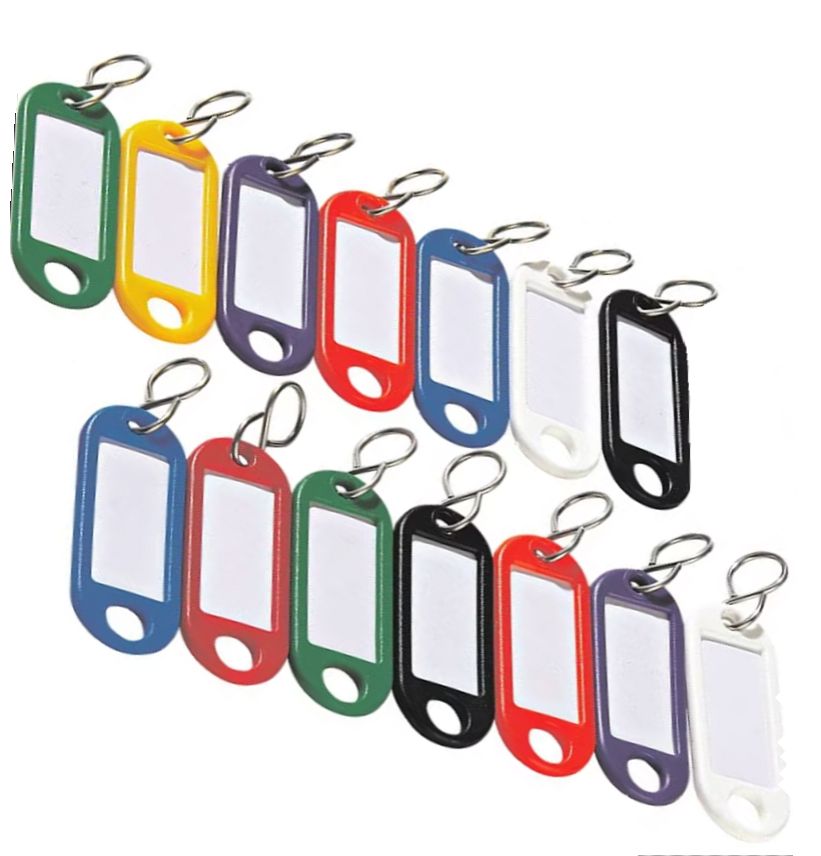 Schlüsselanhänger, mit S-Haken, farbig sortiert, zur übersichtlichen Kennzeichnung aller Schlüssel. Die Etiketten lassen sich leicht beschriften und auswechseln.Anhängergröße: 5,2 x 2,1 x 0,3 cm. VE = 1 Pack mit 100 Stück.