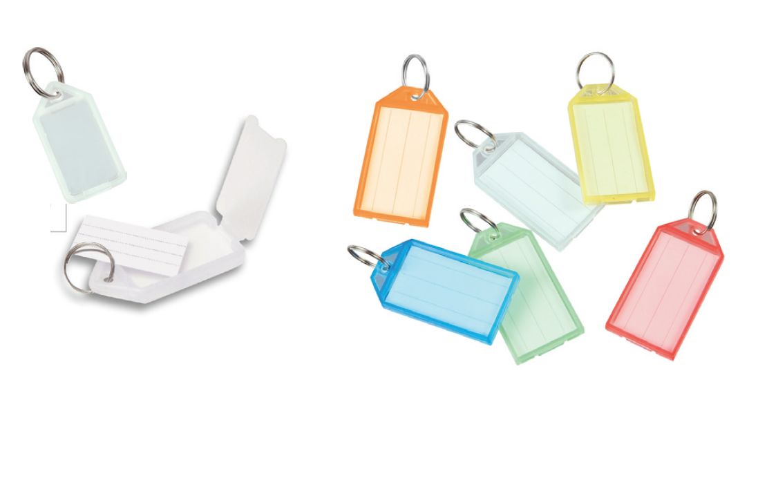 Schlüsselanhänger Multi, farbig sortiert (rot, blau, gelb, grün, orange, transparent), aufklappbar mit innenliegendem Beschriftungsschild, inkl. Schlüsselring, mit Etikett, VE = 1 Pack mit 100 Stück.
