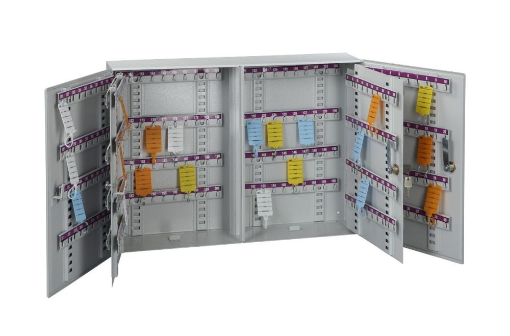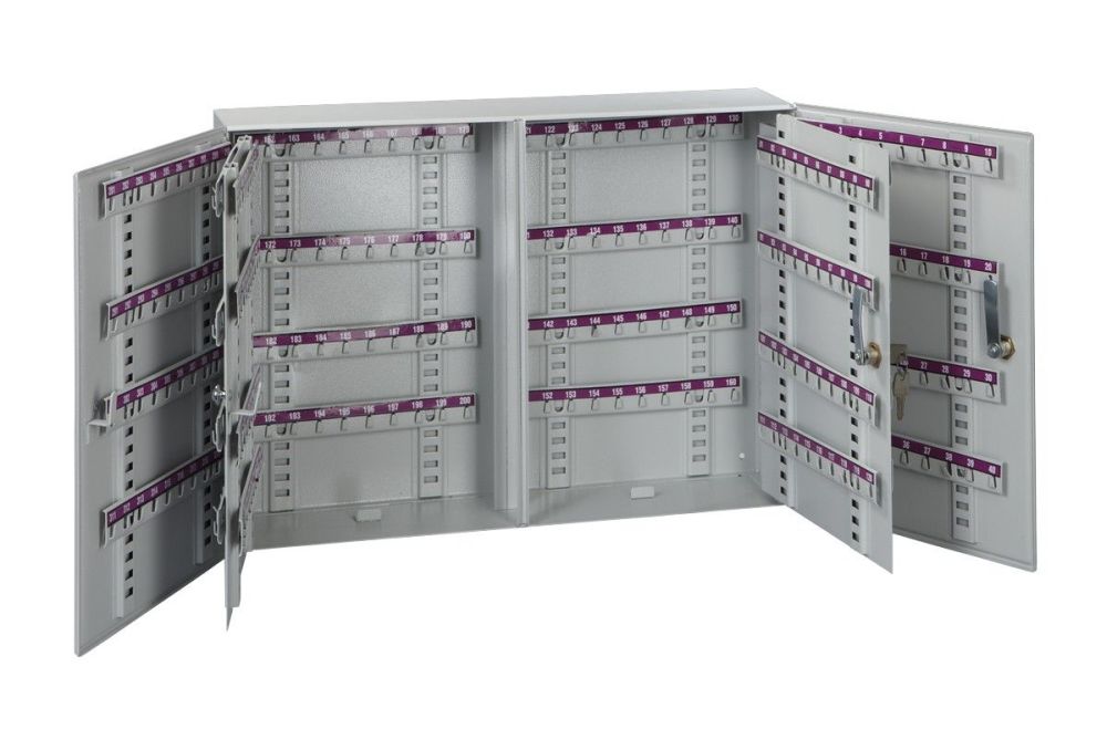 Sicherheits-Schlüsselkasten Korpus aus pulverbeschichtetem, schlag- und kratzfestem Blech, abschließbar, zwei-türig mit zwei Trennwänden, zur Wandmontage vorgesehen.Sicheres Aufbewahren und Verwalten von Schlüsseln - am besten mit den SchlüsselkäsÂten von EICHNER. Wir bieten Ihnen optimale Lösungen für das Schlüsselmanagement von heute. Die hochwertige SchlüsselÂkasten-Serie für praktisch jeden Bedarf. Die Türen und der KorÂpus sind aus robustem, einwandigen Stahlblech, abschließbar durch ein Sicherheits-Zylinderschloß mit 2 Schlüsseln. Die HaÂkenleisten sind höhenverstellbar und können somit einfach auf Ihre Bedürfnisse angepasst werden. Einige Modelle bieten ausÂschwenkbare, abnehmbare Zwischenwände. Alle Modelle sind zur Wandbefestigung vorgesehen und sind mit einer schlag- und kratzfesten Pulverbeschichtung in RAL 7035 (lichtgrau) versehen.VE = 1 Stück